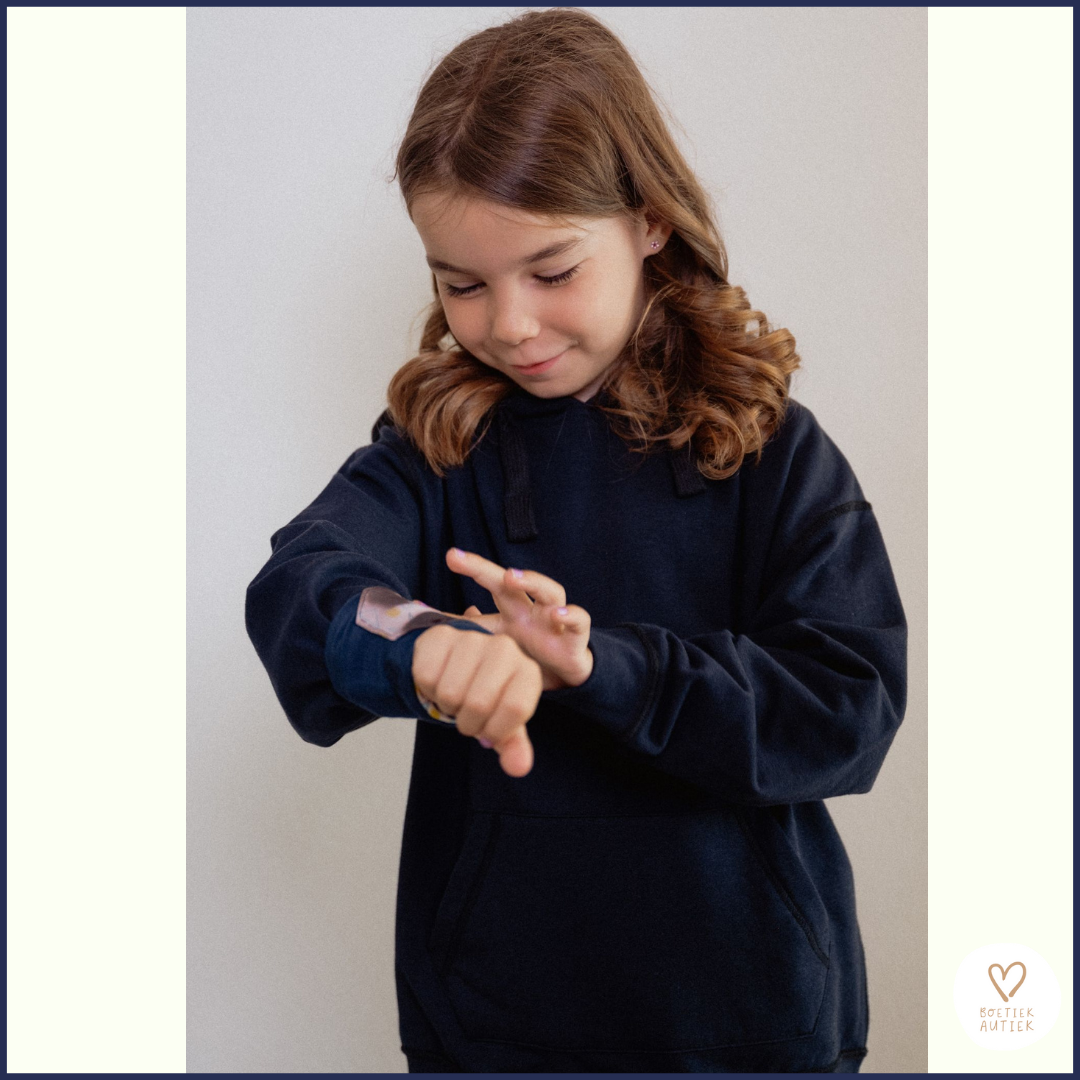 Naast communicatie ondersteunt de mouw rustgevend sensorisch spel. Het strijken over het zachte oppervlak en het observeren van kleurveranderingen helpt kinderen tot zichzelf te komen, emoties te reguleren en opnieuw focussen.