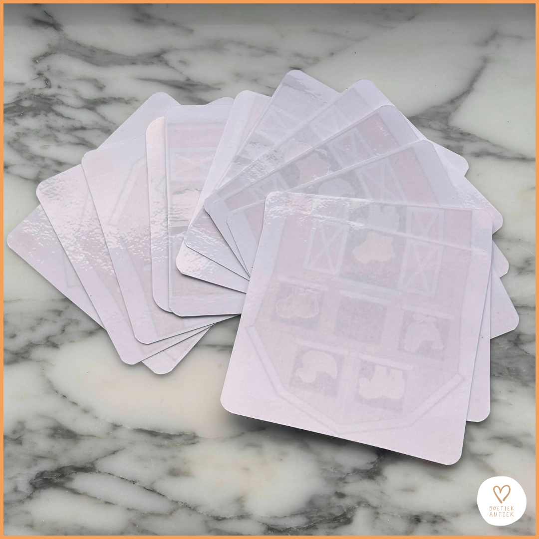 Het spel bevat een prachtige vilten dierenstal en kleurrijke boerderijdieren uit kunststof. Bij het spel behoren kaartjes waarop de stal telkens afgebeeld staat, maar de dieren telkens op een andere plek.