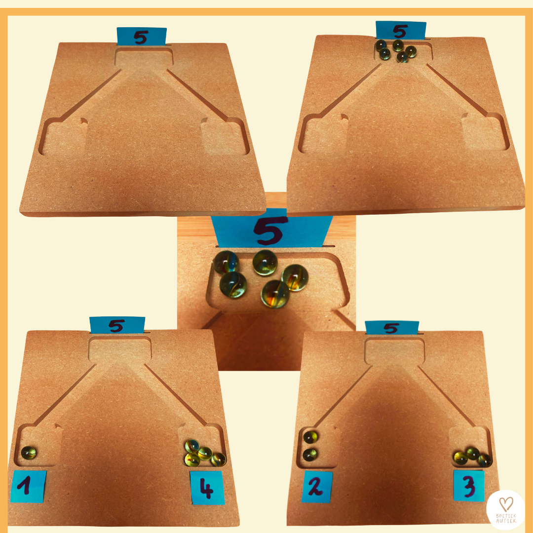 Gebruik de getalkaarten om onder de gesplitste knikkers te leggen.