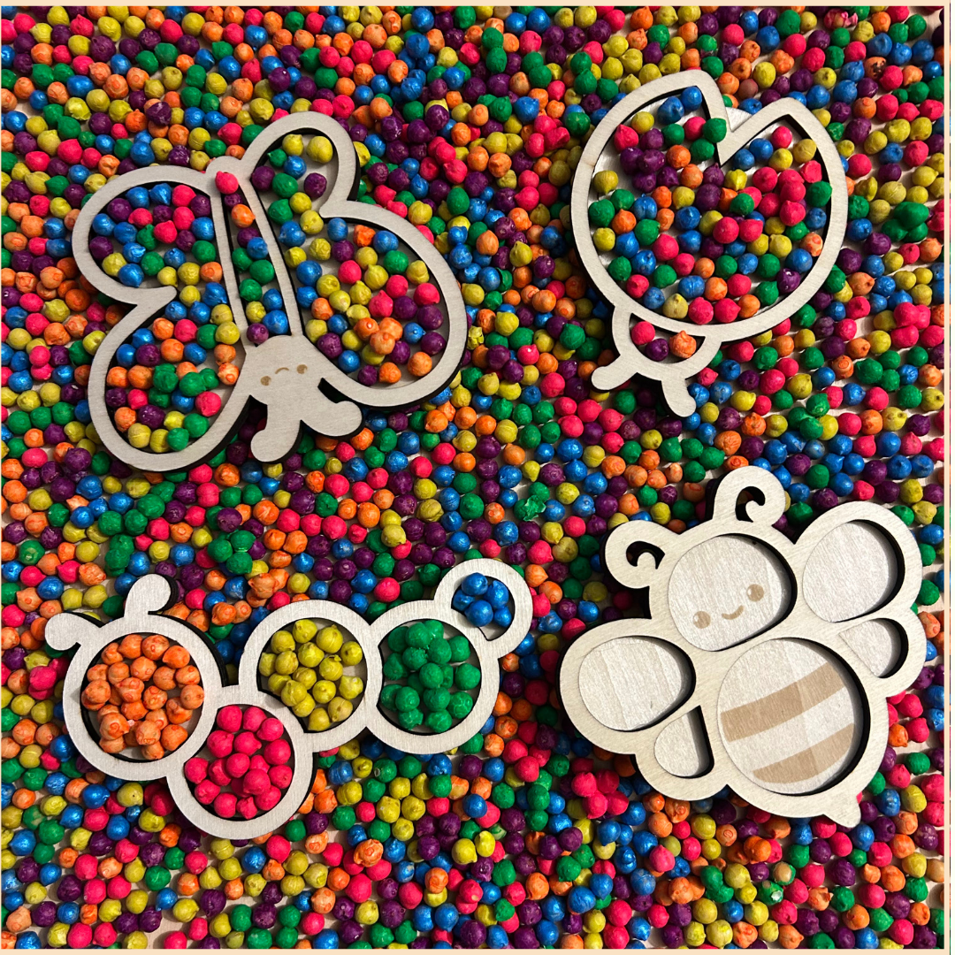Hou jij van de lente? Deze diertjes vind je vast leuk: de vlinder, het onzelieveheersbeestje, de rups en de bij. Leef je helemaal uit tijdens sensorisch spel! Deze vulvormen kan je opvullen met droge materialen naar keuze. Speelrijst, kikkererwten, bolletjes, zand, ... Creëer , combineer, ontwerp en ... geniet! Laat je creativiteit helemaal los. Perfect te vullen met droge materialen zoals speelrijst, kikkererwten, fijn zand,... Dat allemaal in een formaat dat goed in de hand ligt!